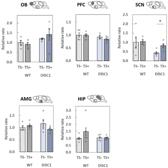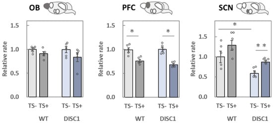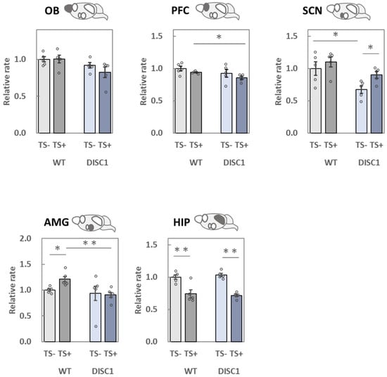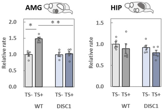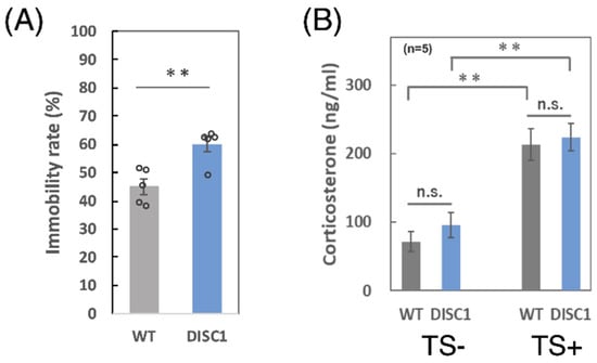 2.2. Comparison between WT and DISC1 Mutant Mice: Evaluation of the Immobility Rate and Concentration of Corticosterone in Serum