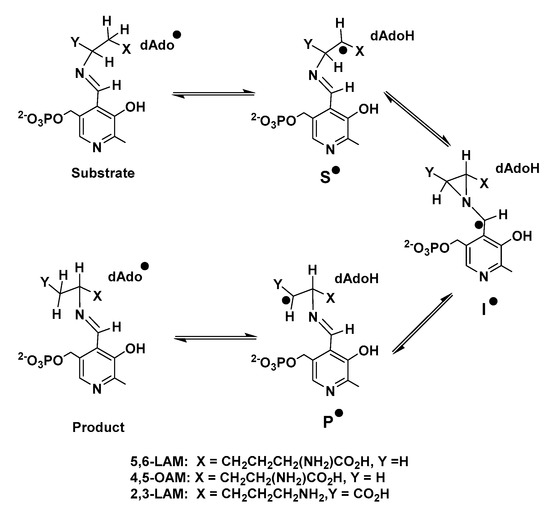 - Lepore, B.W.; Ruzicka, F.J.; Frey, P.A.; Ringe, D. The X-ray crystal structure of lysine-2,3-aminomutase from Clostridium subterminale. Proc. Natl. Acad. Sci. USA 2005, 102, 13819–13824. [Google Scholar] [CrossRef]