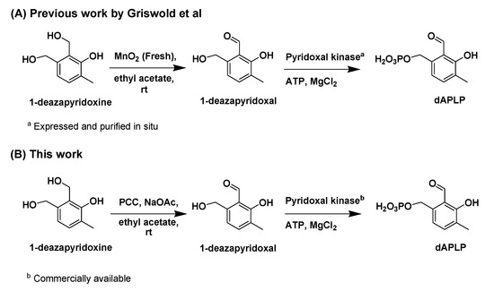 - Griswold, W.R.; Toney, M.D. Chemoenzymatic synthesis of 1-deaza-pyridoxal 5′-phosphate. Bioorg. Med. Chem. Lett. 2010, 20, 1352–1354. [Google Scholar] [CrossRef] [PubMed][Green Version]