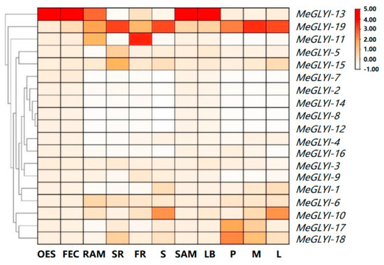 4.2. Expression Analysis of MeGLYIs in Different Tissues and Organs