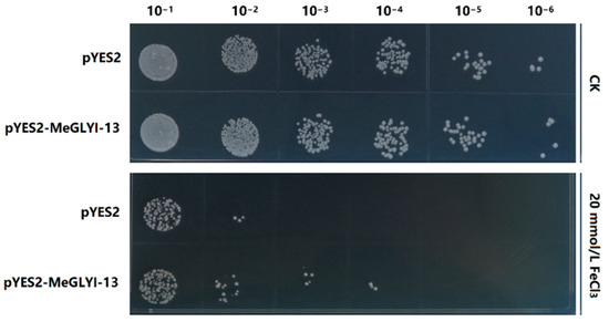 2.4. Overexpression of MeGLYI-13 in Yeast Enhanced the Tolerance to Iron Stress