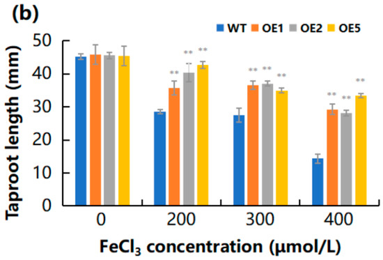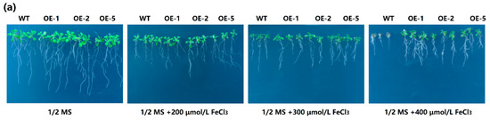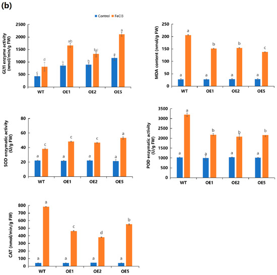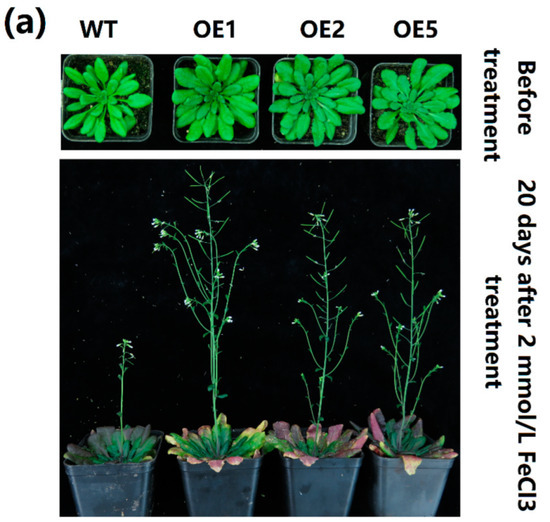 2.5. Overexpression of MeGLYI-13 in Arabidopsis Raised the Tolerance to Iron Stress