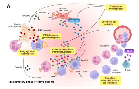 Shortly after the onset of innate immune activation, the ischemic heart recruits a diverse repertoire of innate and adaptive immune cells to the injured site. To this end, cardiac endothelial cells become activated to weaken their tight junctions and express adhesion molecules. Furthermore, cardiomyocytes, cardiac fibroblasts, and resident macrophages begin to produce not only inflammatory cytokines, but also chemokines such as C-C motif chemokine ligand 2 (CCL2), CCL7, C-X-C motif chemokine ligand 1 (CXCL1), and CXCL2, which mobilize bone marrow neutrophils and monocytes to the blood in large numbers and also attract the myeloid cells to the infarcted heart from the circulation [,,]. This chemokine-dependent dynamic behavior of myeloid cells is subsequently enhanced by B cells and recruited neutrophils and monocyte/macrophage themselves via secretion of CXCL2, CCL2, and CCL7 [,]. Cardiac fibroblasts produce and release granulocyte-macrophage colony-stimulating factor (GM-CSF) in response to the engagement of their PRRs, which not only endows monocytes and macrophages with a pro-inflammatory signature, but also stimulates bone-marrow hematopoiesis []. Likewise, various inflammatory mediators such as IL-1β and TLR ligands released from the ischemic myocardium induce the large-scale production of innate immune cells, mainly from hematopoietic stem and progenitor cells (HSPCs) in the bone marrow [,,,]. Together, these early dramatic events with diverse cellular and molecular changes eventually lead to massive immune cell accumulation in the infarcted heart, which has been reflected by strong clinical evidence demonstrating that leukocytosis occurs after acute MI and is an independent predictor of future cardiovascular events [,,].