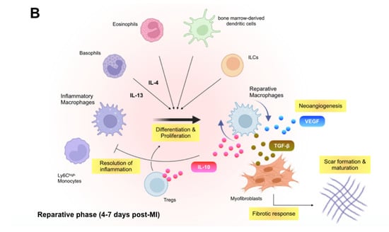 Eosinophils, basophils, and innate lymphoid cells (ILCs) are minor populations in the infarcted myocardium; thus, their role in MI has been overlooked for a long time. However, recent extensive research identified their cardioprotective function in maintaining a proper inflammatory response and promoting appropriate tissue healing after MI. Eosinophils develop in the bone marrow under control of the transcription factor GATA binding protein 1 (GATA1) and cytokines IL-3, IL-5, and GM-CSF and have cytoplasmic granules that contain eosinophilic cationic protein, peroxidase, cytokines, and chemokines. Genetic or inducible depletion of eosinophils exacerbates—whereas expansion of eosinophils by systemic administration of IL-5 favorably alters—cardiac function, cell death, and fibrosis [,,]. A key regulator involved is eosinophil-derived IL-4 that potentially activates the reparative macrophage response. Recently, Sicklinger et al. demonstrated that basophils balance the ratio of pro-inflammatory monocytes to anti-inflammatory Ly6Clow macrophages via IL-4 and IL-13 in the infarcted heart and therefore lead to the appropriate reparative response []. The authors also showed that, in patients with MI, initial low blood basophil counts are associated with worse 1-year clinical outcomes. Another recent research paper reported that ILCs, which are a family of lymphocytes but do not have antigen-specific receptors, expand in the pericardial adipose tissue after experimental MI []. Genetic depletion of ILC type 2 (ILC2s) aggravated—whereas low-dose IL-2 treatment-induced ILC2 expansion improved—cardiac function in a mouse model of MI.