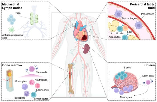 Collectively, multiple organs outside the injured heart are important underpinnings, where innate and adaptive immune cells expand, differentiate, repopulate, and gain a variety of functions. As a result, immune cells in the remote organs essentially contribute to the cardiac wound healing process following MI by secreted mediators or direct infiltration to the heart (Figure 2).