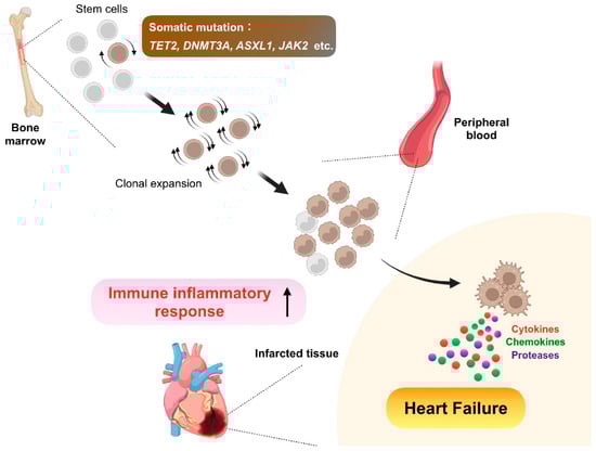 As we age, somatic mutations accumulate in bone marrow HSPCs, some of which confer a competitive advantage or fitness, leading to clonal expansion of the mutated cells. Consequently, the bone marrow expels clonal descendants of the mutant stem cells into peripheral circulation, resulting in more than 10% of individuals by age 70 with these clones accounting, on average, for up to 20% of their peripheral leukocytes. The presence of such clones, referred to as clonal hematopoiesis, indicates a premalignant condition capable of developing into hematologic cancers such as acute myeloid leukemia and myelodysplastic syndromes, albeit with a rare progression rate. Although there has been little information regarding the role of age-related clonal hematopoiesis on chronic disorders, recent epidemiological studies with exome sequence analyses showed that clonal hematopoiesis is associated with an approximately 40% increased cardiovascular risk, independent of traditional risk factors [,]. The incidence of cardiovascular events likely depends on the clone size: a clone size of more than 20% of blood cells results in a higher coronary calcium score, which is a surrogate for atherosclerotic burden detected by computed tomography, whereas a smaller clone size confers a relatively lower risk for developing CVD.