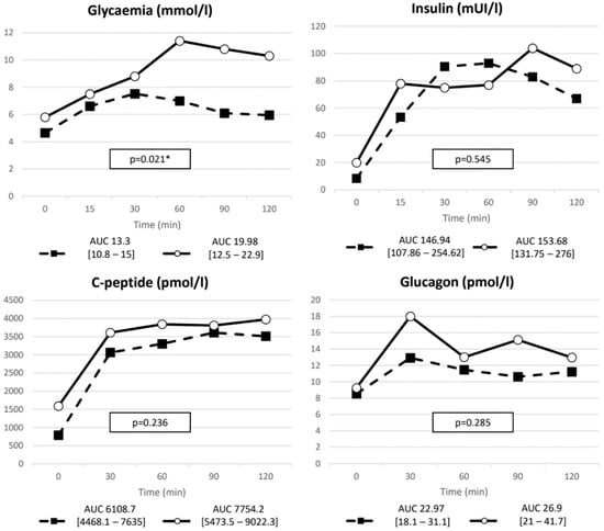| Glucagon | ∆ (pmol/L) | 6.84 (2.7–11.2) | 8.13 (3.22–25.64) | 0.544 |