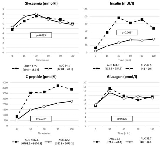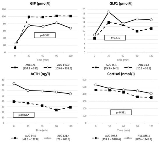 | GIP | ∆ (pmol/L) | 116.5 (84–149.8) | 60.6 (35.7–100.85) | 0.019 |