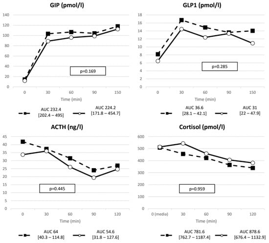 | GIP | ∆ (pmol/L) | 126.1 (91–228.2) | 113.16 (77.5–223.1) | 0.241 |