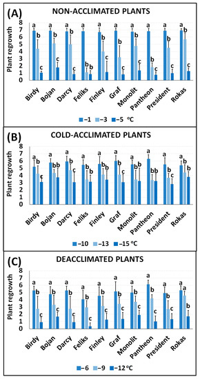 Frost tolerance of ten different cultivars of oilseed rape—Birdy, Bojan, Darcy, Feliks, Finley, Graf, Monolit, Pantheon, President and Rokas—that characterized the (A) non-acclimated plants, (B) cold-acclimated plants and (C) deacclimated plants. Frost tolerance based on the regrowth scale (0–7 points) after frost treatment (−1 to −16 °C); more detailed explanations of scale are in Section 3.3. Mean values ± SD that are marked with the same letters (separately for each cultivar) did not differ significantly at p < 0.05 according to Duncan’s test, n = 15.