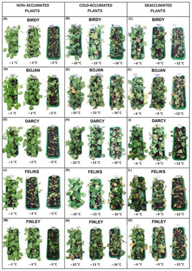 Plants of the non-acclimated, cold-acclimated and deacclimated oilseed rape (cultivars Birdy, Bojan, Darcy, Feliks, Finley) after exposure to frost. After frost treatment, the plants were left to regrow for two weeks at 12 °C. (A,D,G,J,M) non-acclimated plants; (B,E,H,K,N) cold-acclimated plants; (C,F,I,L,O) deacclimated plants.