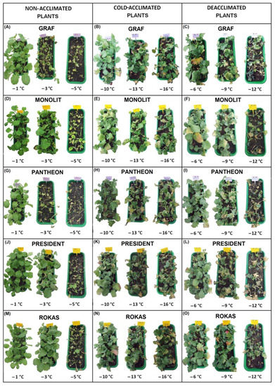 Plants of the non-acclimated, cold-acclimated and deacclimated oilseed rape (cultivars Graph, Monolith, Pantheon, President, Rokas) after exposure to frost. After frost treatment, the plants were left to regrow for two weeks at 12 °C. (A,D,G,J,M) non-acclimated plants; (B,E,H,K,N) cold-acclimated plants; (C,F,I,L,O) deacclimated plants.