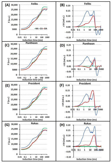 Induction curves of the chlorophyll a fluorescence (F) and the differential curves of ΔVt (obtained by subtracting the control curve (non-acclimated plants—NA)) of oilseed rape. Plants that were not acclimated (NA), cold acclimated (CA) and deacclimated (DA). (A,B) cultivar Feliks; (C,D) cultivar Pantheon; (E,F) cultivar President; (G,H) cultivar Rokas. Statistical analysis of values of typical transient points for curves on figures (A,C,E,G) are given in Table S2.