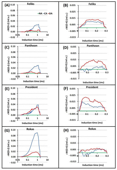 Differential curves of ΔW(O-J) and ΔW(O-K) (obtained by subtracting the control curve (non-acclimated—NA)) of oilseed rape. Plants not acclimated (NA), cold acclimated (CA) and deacclimated (DA). (A,B) cultivar Feliks; (C,D) cultivar Pantheon; (E,F) cultivar President; (G,H) cultivar Rokas.