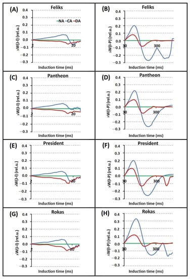 Differential curves of the ΔW(J-I) and ΔW(I-P) (obtained by subtracting the control curve (non-acclimated plants—NA)) of oilseed rape. Plants not acclimated (NA), cold acclimated (CA) and deacclimated (DA). (A,B) cultivar Feliks; (C,D) cultivar Pantheon; (E,F) cultivar President; (G,H) cultivar Rokas.