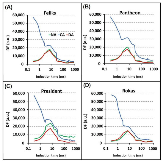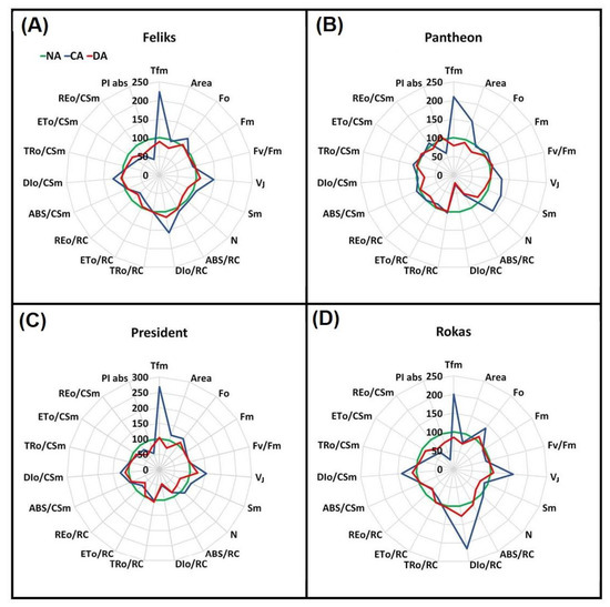 Based on statistical analysis (Table S3), it can be stated that in all tested cultivars, the I1 point showed higher values under CA treatment as compared to NA. Simultaneously, DA treatment triggered the lowest value in all tested cultivars, except in Rokas. In Feliks and Rokas cultivars, the parameter I1-D2/D2 had lower values under CA treatment as compared to NA and DA treatments. The curves for the other cultivars had a similar trend in the I1, I2 and D2 points. Per the available literature, the changes in the I1 point might be related to two phenomena: (1) photochemical—accumulation of certain light-emitting states of the PSII reaction centers, and (2) non-photochemical—increase in the DF due to the electrical gradient formed by PSI when P700 is oxidized [37].