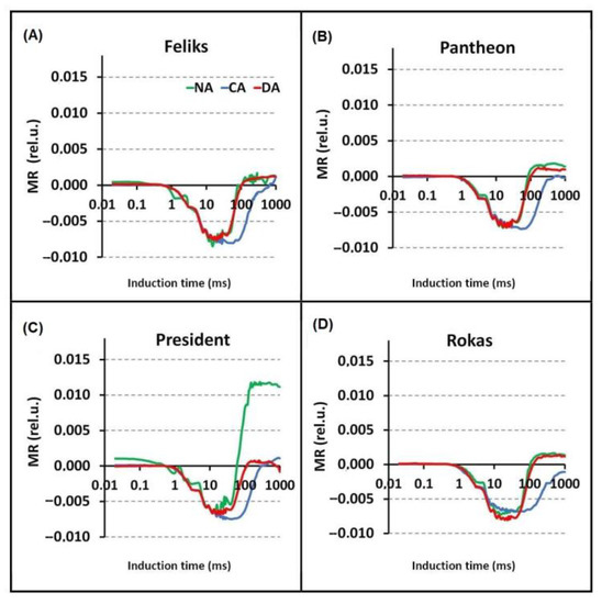 The modulated infrared light reflection at the 820 nm (MR820) signals, which are primarily influenced by the rate of the electron flow from PSII to PSI, showed differences between the treatments and cultivars (in the CA) (Figure 9). The 820 nm reflection of the sample at the onset of the actinic illumination (MR0), the minimum (MRmin) and the maximum (MRmax) were analyzed (Table S4). There were significant changes between MR0 values, in particular treatments, and between cultivars. In all tested cultivars, the values of this parameter were lower under CA treatment as compared to NA. However, in Rokas, these changes were not significant. In addition, significant changes were noted in the MRmax parameter. In all tested cultivars, its values were lower under CA as compared to NA. The above-mentioned changes could have been the result of a limitation on the acceptor side of PSI [40,41]. Concluding remarks for all fluorescence measurements are given in Section 2.3.