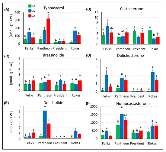 Content of brassinosteroids in the non-acclimated (NA), cold-acclimated (CA) and deacclimated (DA) oilseed rape (cultivars Feliks, Pantheon, President, Rokas). (A) Typhasterol; (B) castasterone; (C) brassinolide; (D) dolichosterone; (E) dolicholide; (F) homocastasterone (28-homocaststerone). Mean values ± SD that are marked with the same letters (separately for each cultivar) did not differ significantly at p < 0.05 according to Duncan’s test, n = 5.