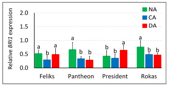 Relative transcript level of BRI1 (brassinosteroid-insensitive 1, encoding the brassinosteroid membrane receptor) in the non-acclimated (NA), cold-acclimated (CA) and deacclimated (DA) oilseed rape (cultivars Feliks, Pantheon, President, Rokas). The transcript level was calculated relative to actin (endogenous reference gene). Mean values ± SD that are marked with the same letters (separately for each cultivar) did not differ significantly at p < 0.05 according to Duncan’s test, n = 3.