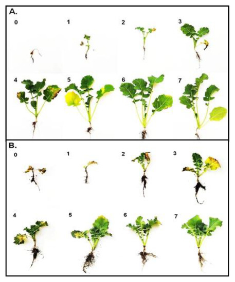 Scale showing the plant injuries after 14 days of their regrowth from the moment of frost exposure; (A) non-acclimated plants (B) cold-acclimated and deacclimated plants. See more details including an explanation of points 0–7 in Section 3.3.