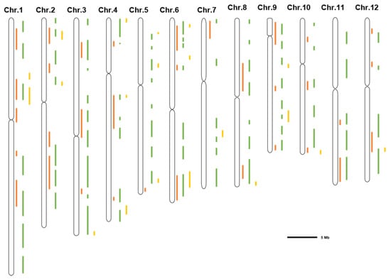 Distribution of salt stress-related QTLs/QTNs detected by GWAS on 12 chromosomes (Chr) of rice. The 12 long columns represent the 12 chromosomes of rice, respectively. The orange, green and yellow bars represent QTLs/QTNs positions detected at the stages of germination [,,,], seedling [,,,,,,,,,,,,] and reproductive [,,,], respectively. The length of the black line in the lower right corner of the figure represents the physical distance of the chromosomes.