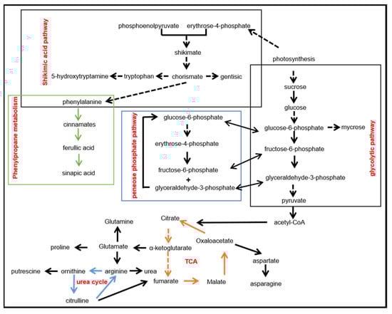 In summary, to provide an overview of these metabolites and their metabolic pathways involved in salt stress, we drew a map as shown in Figure 2. It shows that salt stress is directly associated with the shikimic acid pathway, pentose phosphate pathway, glycolysis pathway, tricarboxylic acid cycle, and ornithine cycle, which play a key role in maintaining osmotic balance and affecting plant growth and development.
