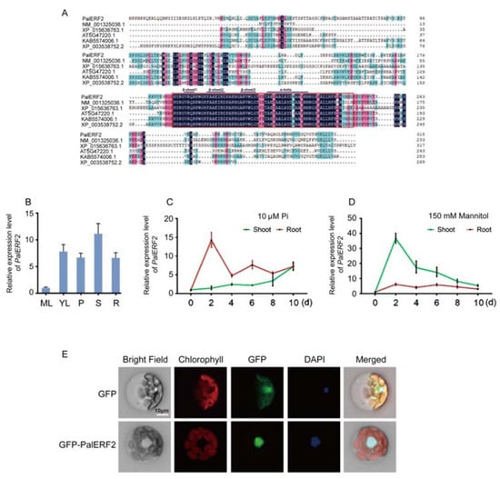Characteristics of PalERF2 of Populus alba var. Pyramidalis. (A) Multiple sequence alignment of ERFs and the accession numbers are derived from different species (NM_001325036.1 from Nicotiana tabacum, XP_015636763.1 from rice, AT5G47220.1 from Arabidopsis thaliana, KAB5574006.1 from Salix brachista, and XP_003538752.2 from Glycine max). (B) The qRT-PCR analysis of PalERF2 expression in root (R), stem (S), mature leaves (ML), young leaves (YL), and petiole (P) in the mediums of MS. (C,D) The temporal expression pattern of PalERF2 under low Pi treatment (10 μM Pi) and 150 mM mannitol treatment in shoot and root, respectively. Error bars indicate SD values from three biological replicates. (E) Subcellular localization of PalERF2 in the mesophyll protoplasts of P. alba var. pyramidalis. The empty vector pBI221-expressing GFP is used as control (upper row) and the PalERF2-GFP fusion proteins are localized in the nucleus only (lower row). DAPI staining indicates the nucleus.