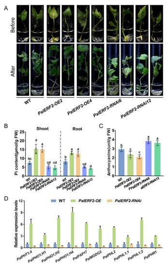 The PalERF2 transgenic poplars under low Pi condition. (A) Phenotypes of transgenic and WT poplars grew in liquid medium with 10 μM Pi for 4 weeks. (B) The Pi contents of transgenic and WT poplars in root and shoot after low Pi treatment. (C) Anthocyanin contents of WT and transgenic poplar after low Pi treatment. Error bars indicate SD values from five biological replicates. Significant differences were analyzed by Duncan’s test (p < 0.05, n = 5). Different letters indicate statistically significant differences. (D) The qRT-PCR analysis of Pi starvation response (PSR) genes in PalERF2-OE, PalERF2-RNAi, and WT poplars. Error bars indicate SD values from three biological replicates.