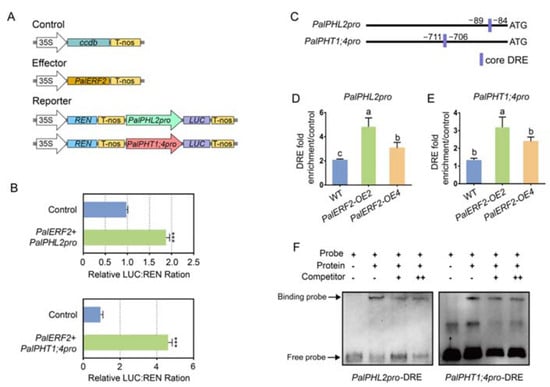 PalERF2 regulates PalPHL2 and PalPHT1;4 expression. (A) Structures of effector and reporters employed in dual-luciferase assay. (B) Transient co-expression of effector and reporter vectors in Nicotiana benthamiana leaves for dual-luciferase assay. Error bars indicate SD values (n = 3). Asterisks indicate significant differences compared to control by Student’s t-test, ***, p < 0.01. (C) Distribution of core DRE motifs in the promoters of PalPHL2 and PalPHT1;4. (D,E) ChIP-qPCR determined the binding of PalERF2 to the PalPHL2 and PalPHT1;4 promoter regions containing DRE, respectively. Error values represent means ± SD (n = 3). Significant differences were analyzed by Duncan’s test (p < 0.05, n = 5). Different letters indicate statistically significant differences. (F) EMSA tested the binding activity of PalERF2 to the DRE in PalPHL2 and PalPHT1;4 promoters. The unlabeled cold probes were added to compete with labeled probes. + means the cold probe is 20 times the labeled probe, ++ means 50 times. The arrows mark the binding probe and free probe.