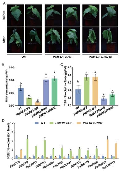 The phenotypes of PalERF2 transgenic poplars under drought stress. (A) The phenotypes of transgenic and WT poplars after 5 days of drought treatment. (B) The MDA contents were measured after drought treatment. (C) The total chlorophyll contents were measured after drought treatment. (B,C) values represents means ± SD (n = 5). Significance of differences was analyzed by Duncan’s test (p < 0.05, n = 5). Different letters indicate statistically significant difference. (D) The relative expression of drought-associated genes in PalERF2-OE, PalERF2-RNAi, and WT poplars. Error bars indicate SD values from three biological replicates.