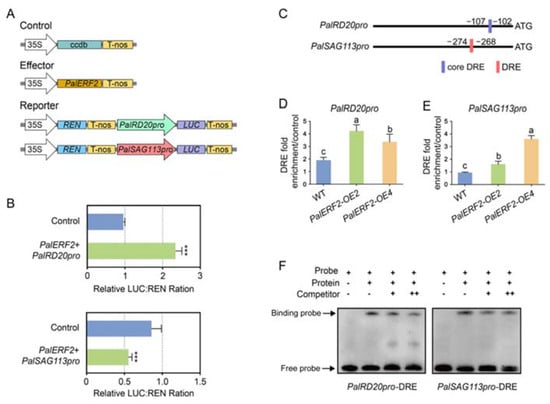 To investigate whether PalERF2 directly regulated these drought-related genes, we analyzed promoters of the genes with differential expressions in PalERF2 transgenic lines compared to WT. We found that there was no GCC box, but at least one DRE element or one core DRE motif in promoters of these genes (Figure S5). For instance, the promoters of PalCOR47, PalPUB23, and PalSAG113 had one DRE element, respectively, while the PalRD20 and PalNAC19 promoters contained a core DRE motif, respectively. We hypothesized that PalERF2 could directly regulate the genes containing DRE elements in the promoters. We firstly determined PalERF2 could increase the transcription activity of PalRD20 and PalSAG113 promoters by a dual-luciferase assay. The results showed that PalERF2 significantly enhanced the fluorescence intensity of PalRD20 promoter driven by LUC compared to the control. However, it repressed the expression of LUC driven by PalSAG113 promoter (Figure 5A,B). ChIP-qPCR assay showed that PalERF2 binds to the promoter regions containing DRE elements in PalRD20 and PalSAG113 overexpression lines in vivo (Figure 5C,D). The EMSA assay showed that the DRE element in the promoters of PalRD20 and PalSAG113 could be bound by MBP-PalERF2 fusion protein, and this binding could be taken apart by cold probes in vitro (Figure 5F). Therefore, PalERF2 directly regulates the expression of PalRD20 and PalSAG113 through the DRE element in their promoters.