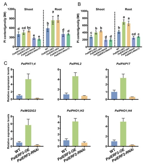 To investigate whether overexpression or knocking-down of PalERF2 affects the expression of PSI genes, we analyzed the expression level of these genes in the transgenic and WT plants by qRT-PCR. As shown in Figure 2D, PalPHT1;4, a Pi transporter [], was up-regulated in overexpression lines. PHL1, PHL2, and PHR1 are considered to be key and function-redundant transcription factors in response to Pi starvation in plants [], and PalPHL1;1, PalPHL1;2, PalPHR1, and PalPHL2 were strongly upregulated in PalERF2-OE poplars. In addition, the PHO1s [], such as PalPHO1;H1, PalPHO1;H2, and PalPHO1;H4, which are responsible for transferring Pi to the xylem and ultimately into the stem, were also up-regulated in transgenic plants. However, the above PSI genes are down-regulated in PalERF2-RNAi poplars. SPX3, which encoded a repressor of PSR by interacting with OsPHR2 in rice [], was up-regulated in overexpressing PalERF2 poplars and down-regulated in PalERF2-RNAi lines. A purple acid phosphatase gene PalPAP17 [] and a type B monogalactosyldiacylglycerol synthase gene PalMGDG2 [], showed opposite expression patterns in overexpressing and knocking-down poplars. These results indicated that PalERF2 directly or indirectly regulate some PSI genes.