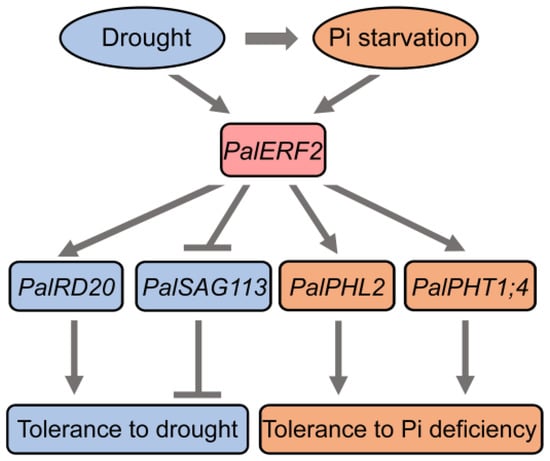 The proposed model for the PalERF2 mediated drought stress and low Pi responses in poplars.