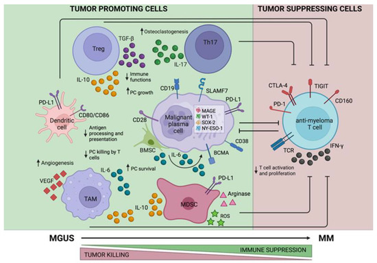 MM-associated immunological BM niche. Disease progression from MGUS to MM is associated with changes in the BM immune microenvironment, with progressive impairment of tumor suppressing cells (mainly anti-MM effector T cells) and accumulation of tumor promoting cells, such as regulatory T cells (Tregs), Th17 cells, tumor associated macrophages (TAMs), myeloid-derived suppressor cells (MDSCs), and suppressive dendritic cells (DCs). ↓: decrease; ↑: increase; ⊥: inhibition; PC: plasma cell; BMSC: bone marrow stromal cells; SLAMF7: signaling lymphocyte activation molecule family 7; BCMA: B-cell maturation antigen; MAGE: melanoma-associated antigen; WT1: Wilms’ tumor 1; SOX-2: SRY-box transcription factor 2; NY-ESO-1: New York esophageal squamous cell carcinoma 1; PD-L1: programmed death ligand 1; IL-6: interleukin 6; IL-10: interleukin 10; IL-17: interleukin 17; TGF-β: transforming growth factor β; VEGF: vascular endothelial growth factor; ROS: reactive oxygen species; IFN-γ: interferon γ; TCR: T cell receptor; PD-1: programmed cell death protein 1; CTLA-4: cytotoxic T-lymphocyte antigen 4; TIGIT: T cell immunoreceptor with Ig and ITIM domains.
