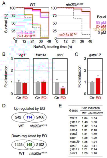 Because we detected antioxidant effects of equol using our zebrafish assay system, we next investigated its mechanism using zebrafish genetics (Figure 2A). First, we analyzed three concentrations of equol (12.5, 25, and 50 μM) using wild-type larvae to find its optimum concentration and determined that 25 μM was the best. Next, the protective effect of 25 μM equol against arsenite toxicity was analyzed in Nrf2-mutant zebrafish (nfe2l2afh318) [13]. The concentration of sodium arsenite was set at 1.4 mM because Nrf2 mutants were weaker to arsenite compared with wild-type larvae [16]. As a result, equol was able to alleviate lethality against arsenite even in the Nrf2-mutant larvae, suggesting that the antioxidant effects of equol were Nrf2-independent.