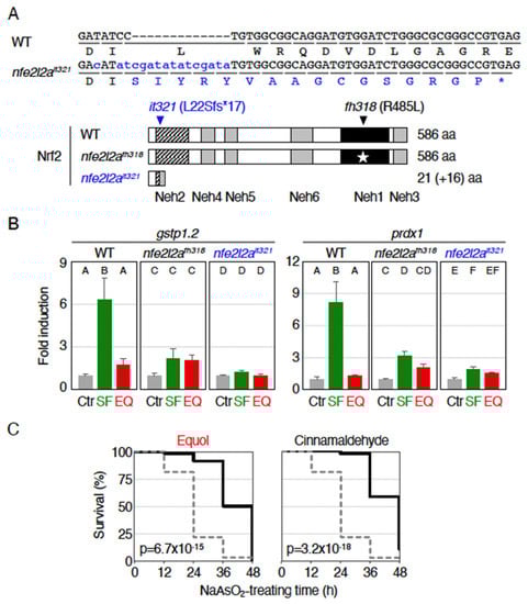 Using nfe2l2ait321 larvae, we next analyzed the protective effects of equol pretreatment against arsenite toxicity (Figure 3C). As a positive control, we used a cinnamon-derived cinnamaldehyde, whose pretreatment had previously shown a strong protective activity against arsenite even in nfe2l2afh318 [16]. Both compounds could significantly alleviate lethality against 1.4 mM sodium arsenite in nfe2l2ait321 homozygous larvae. The result was similar with that of the Nrf2-mutant line nfe2l2afh318 (see Figure 2), confirming that the antioxidant effects of equol were indeed Nrf2-independent.