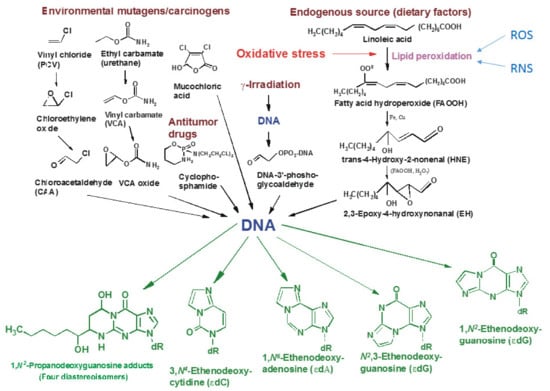 - Kowalczyk, P.; Ciesla, J.M.; Komisarski, M.; Kusmierek, J.T.; Tudek, B. Long-chain adducts of trans-4-hydroxy-2-nonenal to DNA bases cause recombination, base substitutions and frameshift mutations in M13 phage. Mutat. Res. 2004, 550, 33–48. [Google Scholar] [CrossRef]