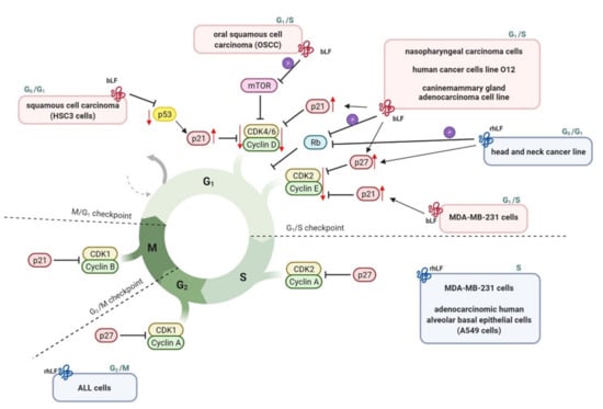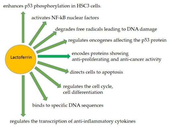 | Direct | DNA binding | Gene expression modulation - DNA repair - Cell cycle regulation - Apoptosis regulation - Immune response modulation: ✓ the cytotoxic functions of NK and lymphokine-activated killer cells enhancement; ✓ cytokine synthesis modulation LF degradation by free radicals | [26,138,139,140,141,142,143] [91] |
