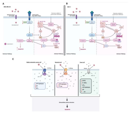 - Pereira, C.S.; Guedes, J.P.; Goncalves, M.; Loureiro, L.; Castro, L.; Geros, H.; Rodrigues, L.R.; Corte-Real, M. Lactoferrin selectively triggers apoptosis in highly metastatic breast cancer cells through inhibition of plasmalemmal V-H+-ATPase. Oncotarget 2016, 7, 62144–62158. [Google Scholar] [CrossRef]