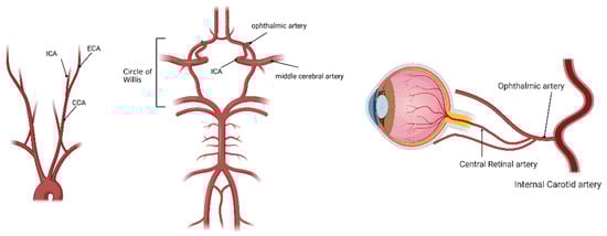 Ocular ischemic syndrome (OIS) is one of the ocular disorders caused by severe carotid artery occlusion or stenosis leading to hypoperfusion [,]. OIS occurs when there is a blockage of the ophthalmic artery, the branch of the internal carotid artery (ICA) (Figure 1). OIS is particularly common in patients with deficient collateral circulation between the left and right ICA or between the ICA and the external carotid artery (ECA). Patients with good collateral circulation who even have occlusion of the ICA may not develop OIS. However, patients with poor collateral circulation may develop OIS with less than 50% ICA stenosis []. Hedges reported diseases associated with ICA occlusion in 1963, and 20% of cases were caused by bilateral occlusions []. OIS is diagnosed in about 7.5 cases per million per year []. It is commonly caused in aging patients with diabetes, hypertension, and hyperlipidemia. Atherosclerosis, carotid artery dissection, trauma, and giant cell arteritis can sometimes cause OIS.