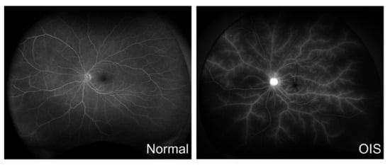 As an invasive test, carotid angiography is often used for the diagnosis. Carotid angiography is performed in advanced cases and before planning carotid surgery []. Angiography with magnetic resonance (MR) or computed tomography (CT) is also helpful to diagnose carotid artery stenosis []. Fundus fluorescein angiography is also a commonly used test for diagnosing OIS (Figure 2). Prolonged circulation time of the arm to choroid and the arm to retina is a frequent sign; approximately 60% of patients with OIS have irregular and prolonged filling times. This is the specific fluorescein angiographic sign of OIS [,]. Indocyanine green angiography can also help to confirm the diagnosis of OIS. This test can detect abnormalities in the choroidal circulation. Like fluorescein angiography, the prolonged circulation time of the arm to choroid can be seen in OIS patients using this test []. Electroretinography (ERG) can also assist in the diagnosis. Because the lack of both retinal and choroidal circulation in the OIS eyes causes the inner and outer retina to be ischemic, the amplitudes of both a- and b-waves are reduced [].