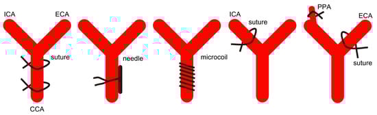 Experimental models of OIS suggested in the current review article. There are various methods of developing experimental models of OIS using unilateral or bilateral sutures, needles, and microcoils in mice and rats. Occlusion sites also vary depending on the studies, as discussed in Section 2. CCA, the common carotid artery; ICA, the internal carotid artery; ECA, the external carotid artery; PPA, the pterygopalatine artery.