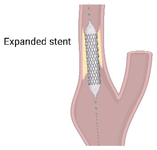 On the other hand, CAS is a procedure in which an expanding stent is inserted into the carotid artery to increase blood flow to the area blocked by plaque (Figure 4). CAS is performed on patients for whom CEA may cause complications, such as those who have had previous radiation, neck surgery, recurrent stenosis, tracheostomy, or complicated surgery with stenosis above the second cervical (C2) vertebral level. High-risk patients such as those with unstable angina, congestive heart failure, and recent myocardial infarction are also indicated for stent []. It has been reported that there is no difference in the outcomes of CAS and CEA in terms of perioperative stroke, myocardial infarction, death, and 4 year incidence of ipsilateral stroke after the perioperative period [].