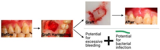 The workflow and potential complications that can occur with a connective tissue graft. The string of green dots represents bacteria. Created with BioRender.com with images from Dr. Michael Glogauer (University of Toronto) and images reproduced with permission under terms of the CC-BY license [31]. Copyright 2014, Sakshee Trivedi, Neeta Bhavsar, Kirti Dulani, and Rahul Trivedi published by the Journal of Clinical and Experimental Dentistry. Created with BioRender.com, accessed on 8 April 2022.