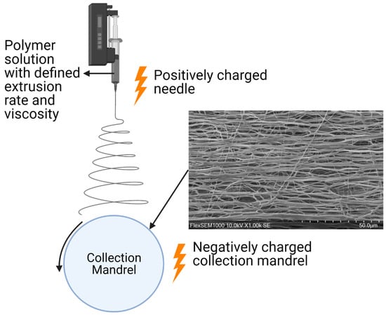 The electrospinning process with a scanning electron microscopy image of an electrospun scaffold taken by the author. Created with BioRender.com, accessed on 8 April 2022.