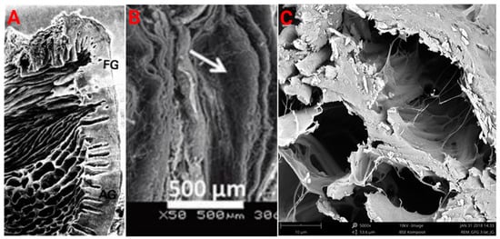 Scanning electron microscopy images of different gingival tissue and previously reported constructs. (A) Scanning electron microscopy images of native gingival tissue. FG: free gingival, AG: attached gingiva. Reproduced with permission [68]. Copyright 1981, published by the Journal of Periodontal Research. (B) Scanning electron microscopy images of layered poly(l-lactic acid) electrospun scaffolds with adipose-derived stem cells and collagen. The white arrow indicates delamination of the scaffold layers. Reproduced with permission [70]. Copyright 2010, published by the Tissue Engineering—Part C: Methods. (C) Scanning electron microscopy images of a Geistlich® Fibro-Gide® matrix. Copyrights by courtesy of Geistlich Pharma AG.