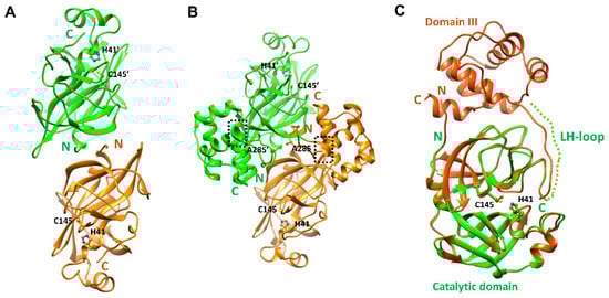 The entire SARS-CoV-2 3CLpro is known to function as a dimer. In addition, its domain III was thought to be crucial for catalytic activity []. Nevertheless, there are some significant features of the catalytic domain noteworthy in structural and functional aspects. At first, the N-terminal domain alone can contribute to forming a dimer through the N-terminal loop swap, as shown in the X-ray crystal structures of the entire and catalytic domains of SARS-CoV-2 3CLpro. Second, the monomeric form alone is enough for its catalytic activity despite its low efficiency. Third, the LH-loop is important for substrate binding and catalytic activity by finalizing the construction of the catalytic pocket. Therefore, the catalytic domain alone can exert its enzymatic activity as we observed. Similar properties were also found in the entire SARS-CoV 3CLpro. In low protein concentrations, the monomer form also displayed an enzymatic activity with low efficiency [].