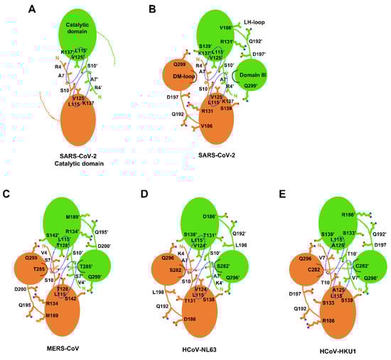 Key interactions involved in dimerization. The two subunits were drawn with different colors, and key residues were represented by a stick model. The distances of hydrogen bonds between residues on domain III are found in the text. The dotted blue circles indicate where hydrophobic pockets exit. (A) the catalytic domain of SARS-CoV-2 3CLpro; (B) SARS-CoV-2 3CLpro; (C) MERS- CoV-2 3CLpro; (D) HCoV-NL63 3CLpro; (E) HCoV-HKU1 3CLpro.