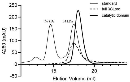 The size-exclusion chromatography of SARS-CoV-2 3CLpro. The thin line represents the makers (human albumin and TCTP), the thick line represents the catalytic domain, and the dotted line represents the full 3CLpro.