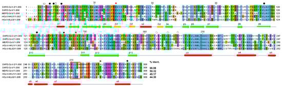 The sequence alignment of 3CLpros. Secondary structure elements of 3CLpro are displayed and colored in red for α-helix, in green for β-strand, and in yellow for 310-helix. The sequences of 3CLpros were extracted from PDBs: 7K0F for SARS-CoV-2, 6W2A for SARS-CoV, 4YLU for MERS-CoV, 3D23 for HCoV-HKU1, and 5GWY for HCoV-NL63. The red stars indicate the catalytic residues. The residues involved in the N-terminal loop swapping are depicted with circles. The circles and the filled circles represent hydrophilic and hydrophobic interactions, respectively. The diamonds represent the interaction between the LH-loop and domain III, filled diamonds represent the dimeric interaction between Ser139 and Q299, and red represents the DM-loop interaction.